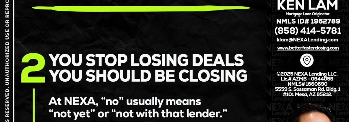 Hi, my name is Ken Lam. I’m a Loan Officer with NEXA Lending LLC., offering personalized mortgage solutions, fast customized quotes, great rates and service with integrity.