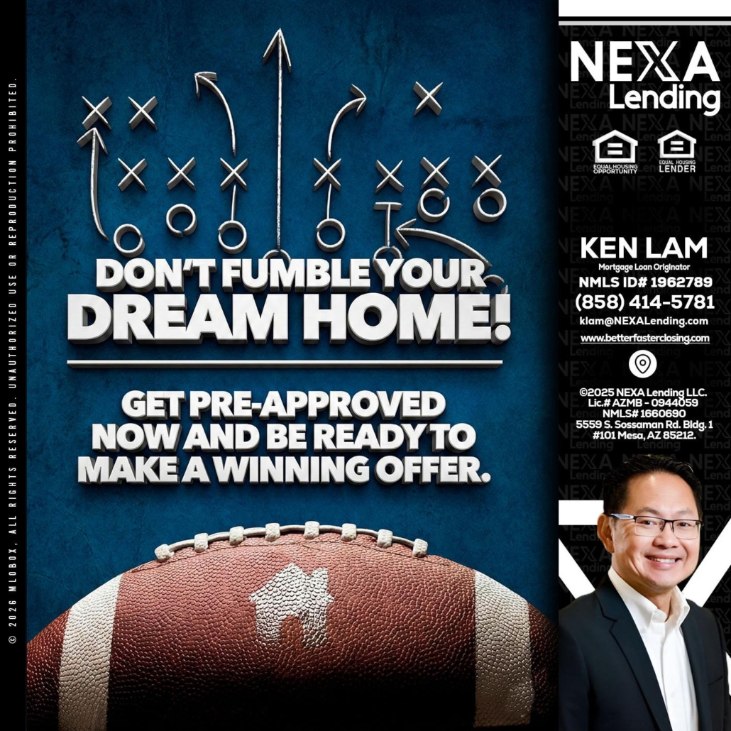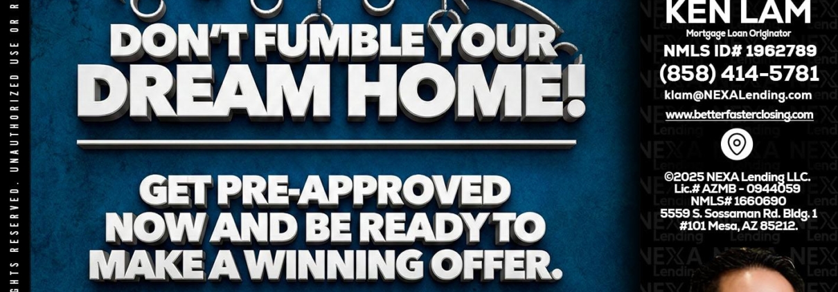 dont fumble - Ken Lam -Mortgage Loan OfficerHi, my name is Ken Lam. I’m a Loan Officer with NEXA Lending LLC., offering personalized mortgage solutions, fast customized quotes, great rates and service with integrity.