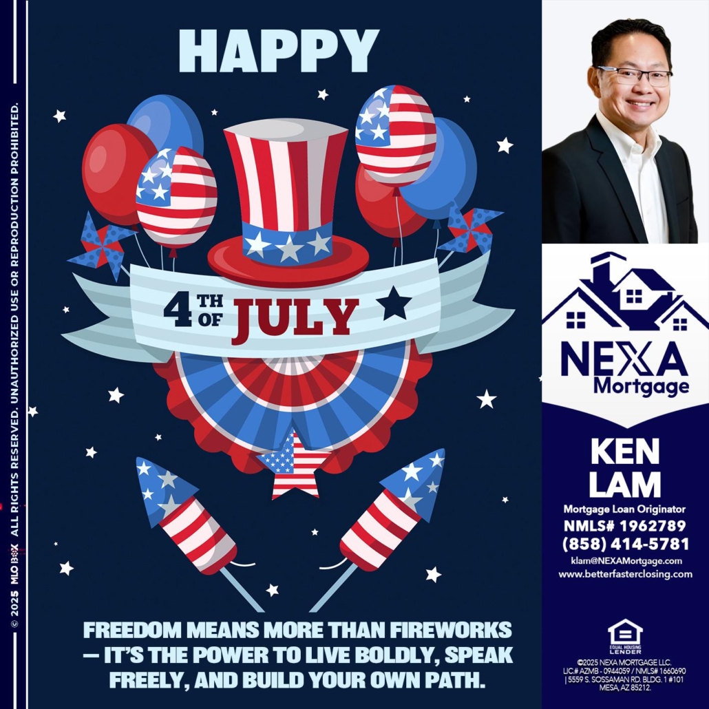 HAPPY 4TH OF JULY - Ken Lam -Mortgage Loan OfficerHi, my name is Ken Lam. I’m a Loan Officer with NEXA Mortgage LLC., offering personalized mortgage solutions, fast customized quotes, great rates and service with integrity.
