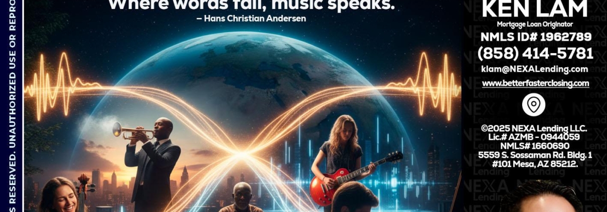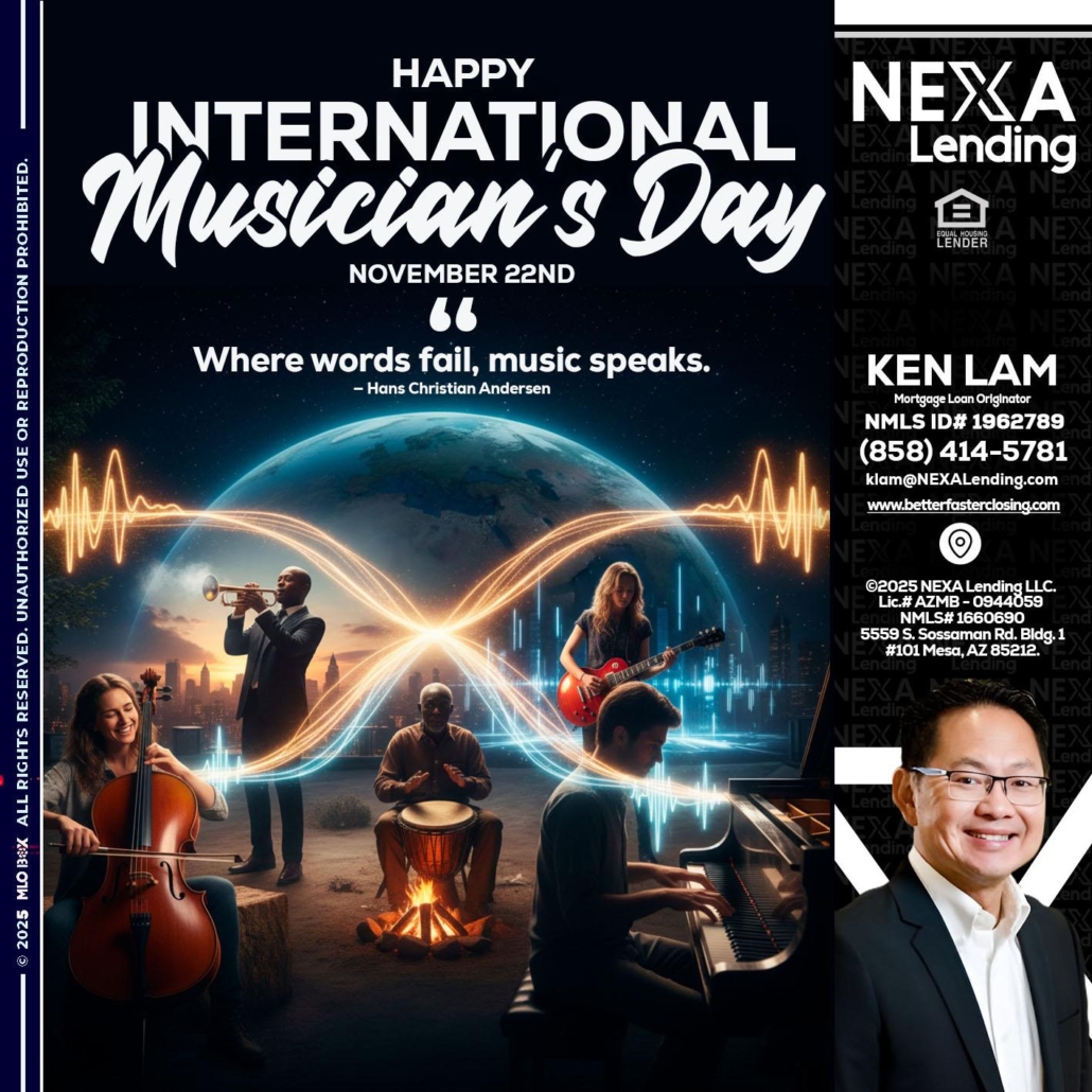HAPPY INTERNATIONAL MUSICIAN'S DAY - Ken Lam -Mortgage Loan OfficerHi, my name is Ken Lam. I’m a Loan Officer with NEXA Mortgage LLC., offering personalized mortgage solutions, fast customized quotes, great rates and service with integrity.