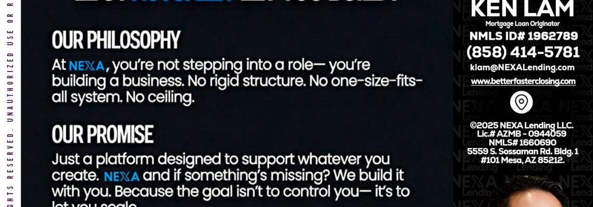 Hi, my name is Ken Lam. I’m a Loan Officer with NEXA Lending LLC., offering personalized mortgage solutions, fast customized quotes, great rates and service with integrity.