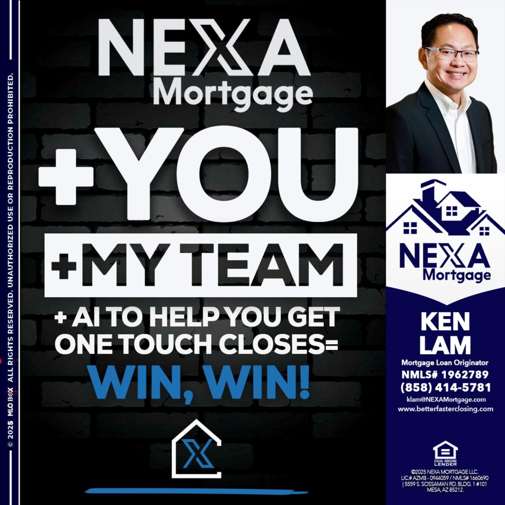 Hi, my name is Ken Lam. I’m a Loan Officer with NEXA Mortgage LLC., offering personalized mortgage solutions, fast customized quotes, great rates and service with integrity.