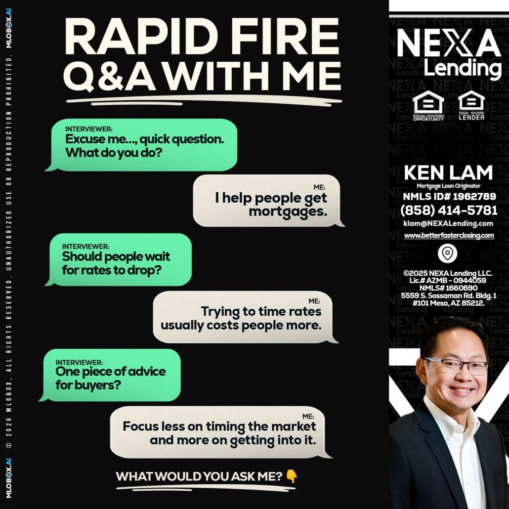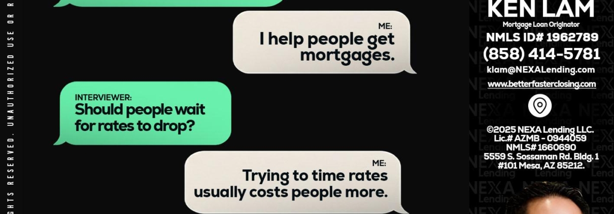 Hi, my name is Ken Lam. I’m a Loan Officer with NEXA Lending LLC., offering personalized mortgage solutions, fast customized quotes, great rates and service with integrity.