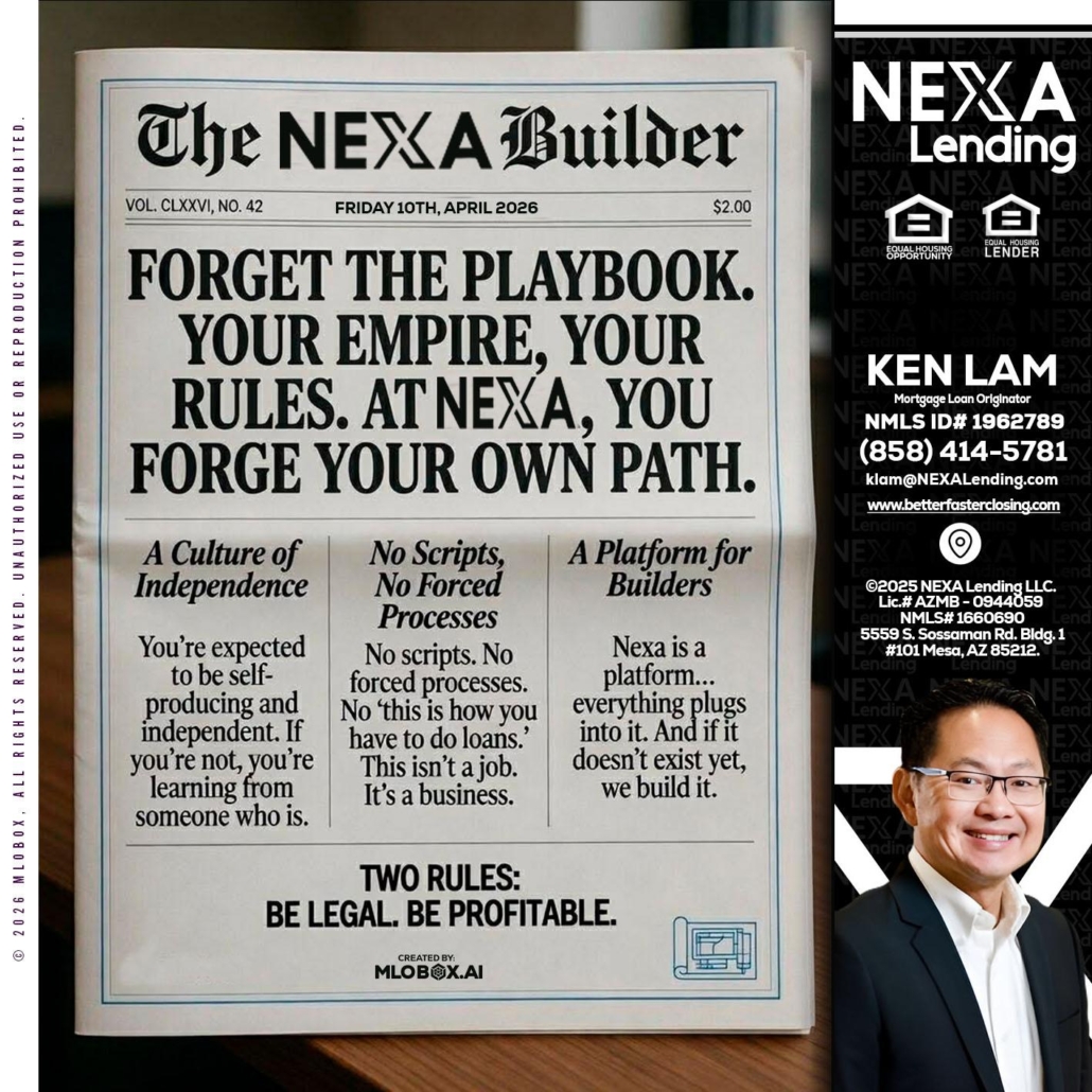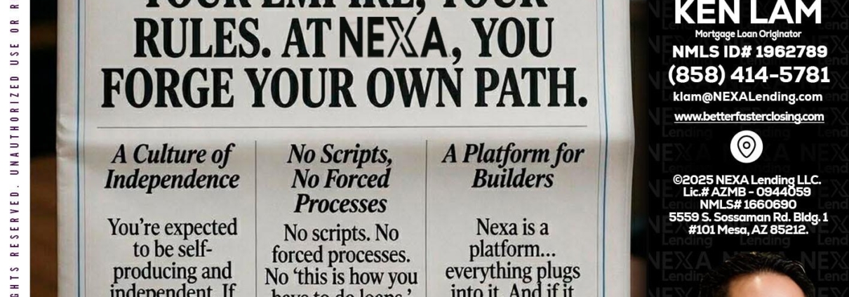 Hi, my name is Ken Lam. I’m a Loan Officer with NEXA Lending LLC., offering personalized mortgage solutions, fast customized quotes, great rates and service with integrity.