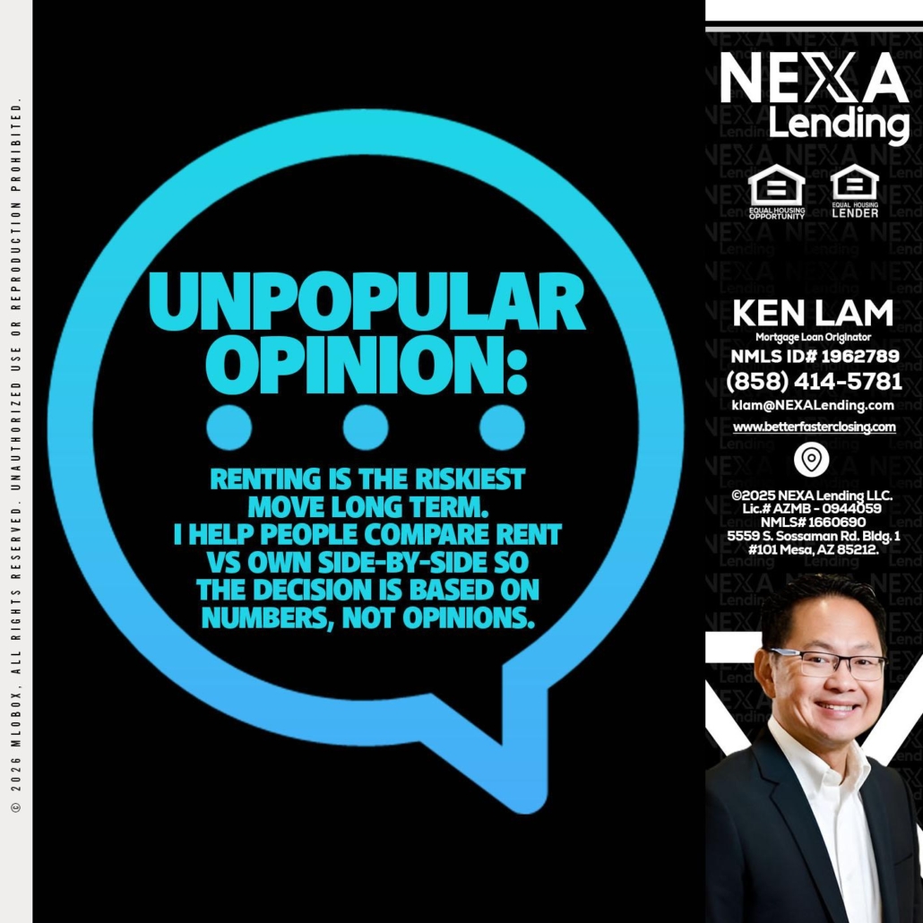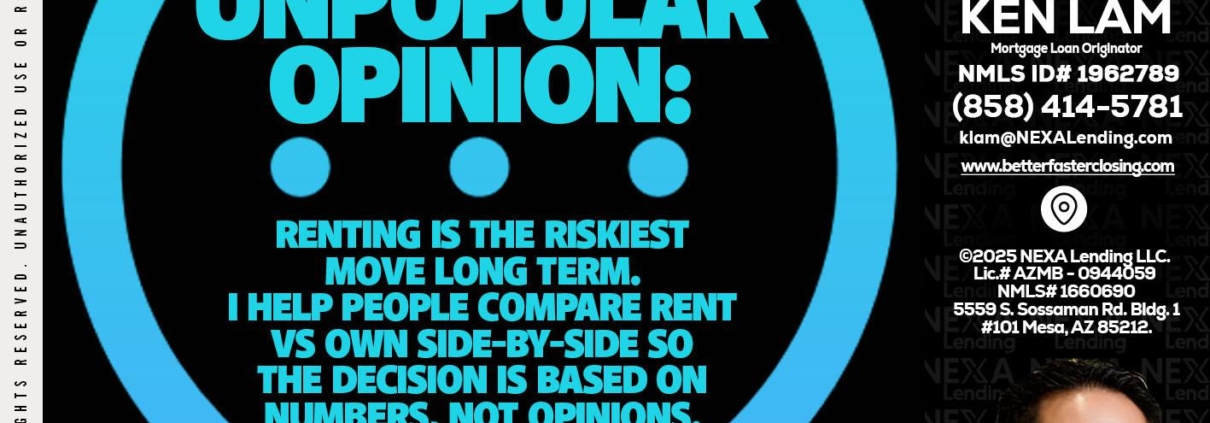 Hi, my name is Ken Lam. I’m a Loan Officer with NEXA Lending LLC., offering personalized mortgage solutions, fast customized quotes, great rates and service with integrity.