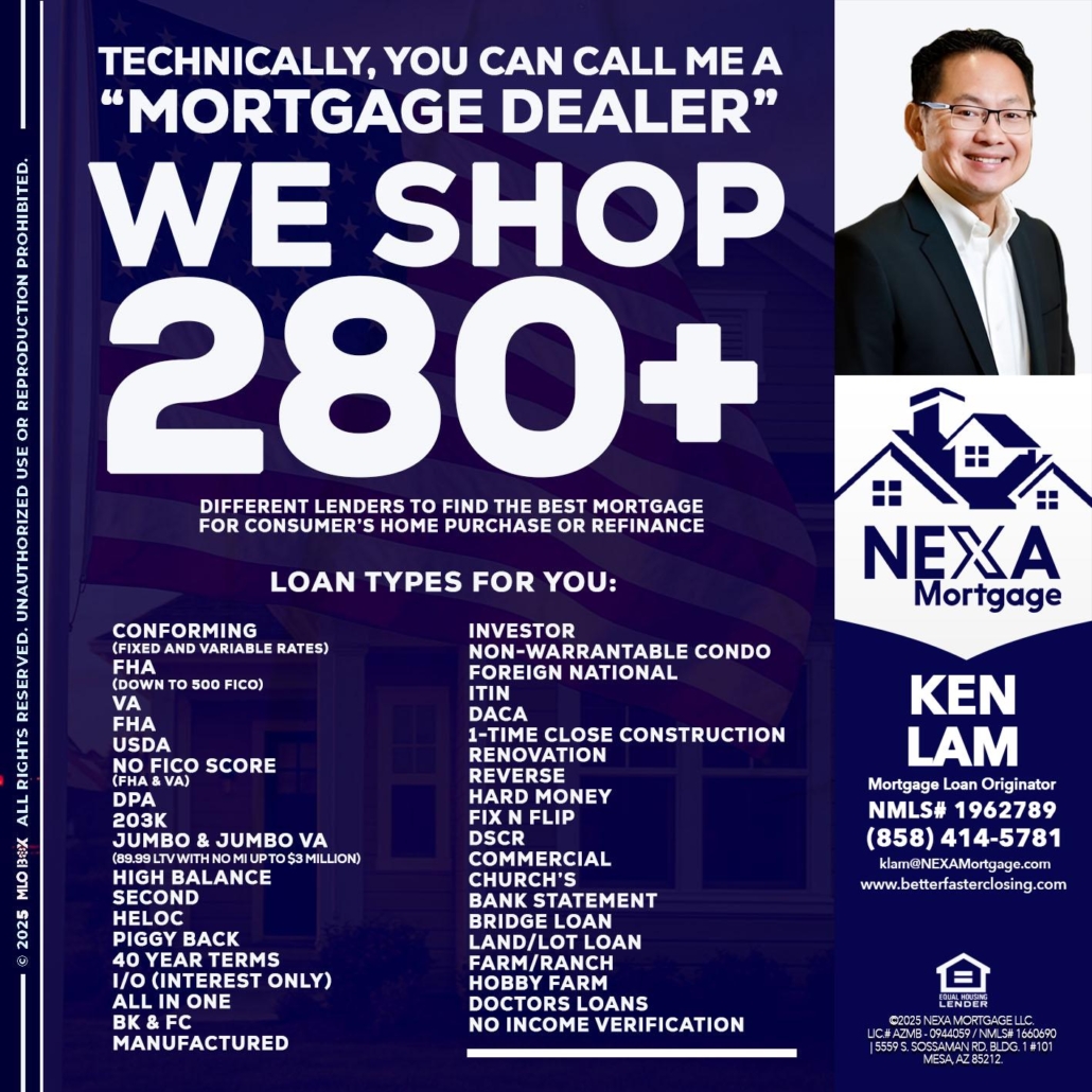 WE SHOP 280 + - Ken Lam -Mortgage Loan OfficerHi, my name is Ken Lam. I’m a Loan Officer with NEXA Mortgage LLC., offering personalized mortgage solutions, fast customized quotes, great rates and service with integrity.