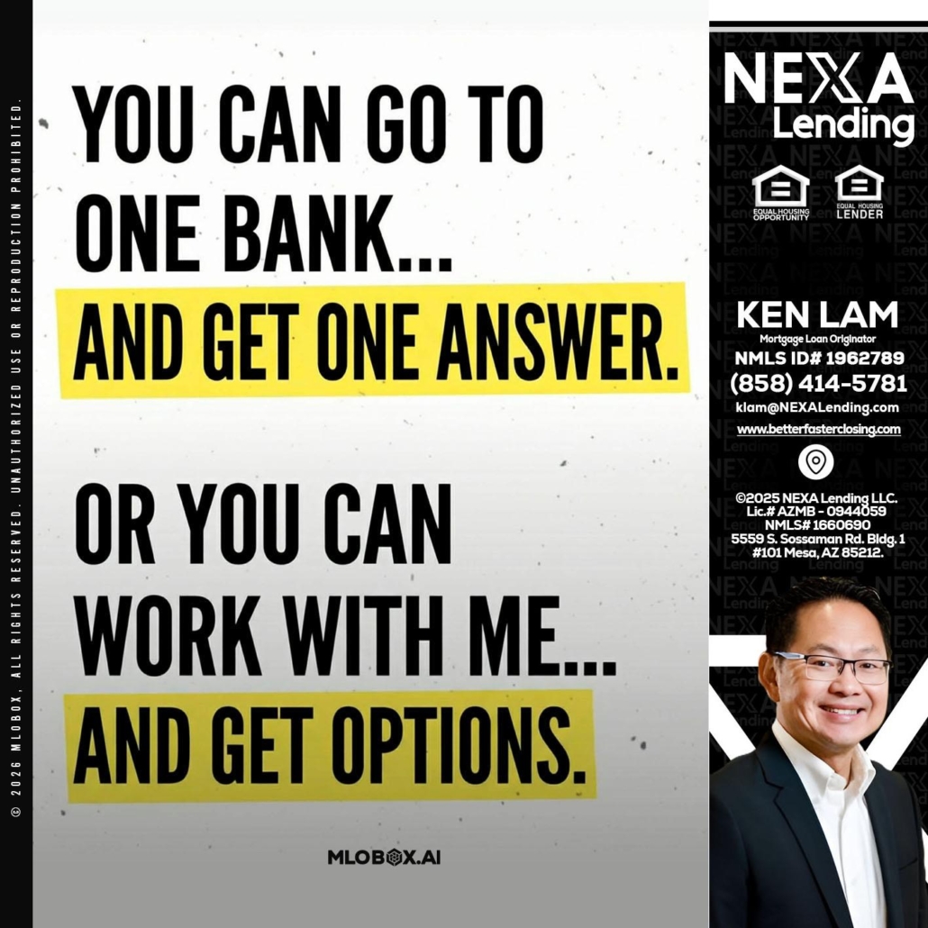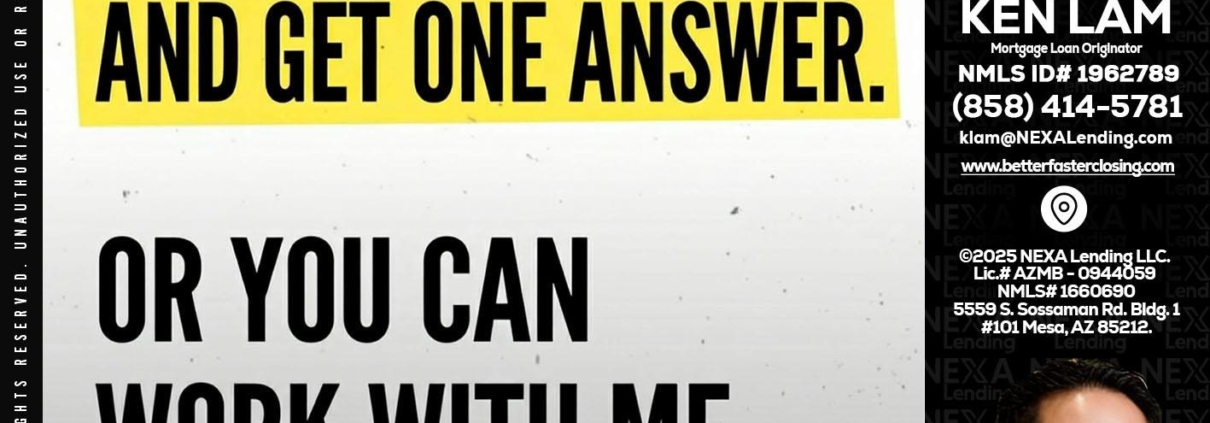 YOU CAN GO TO - Ken Lam -Mortgage Loan OfficerHi, my name is Ken Lam. I’m a Loan Officer with NEXA Lending LLC., offering personalized mortgage solutions, fast customized quotes, great rates and service with integrity.