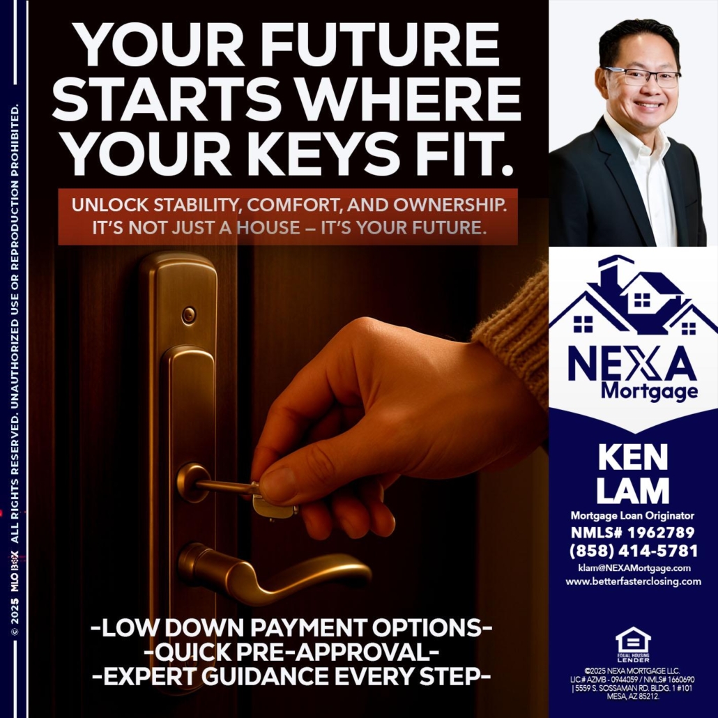 YOUR FUTURE - Ken Lam -Mortgage Loan OfficerHi, my name is Ken Lam. I’m a Loan Officer with NEXA Mortgage LLC., offering personalized mortgage solutions, fast customized quotes, great rates and service with integrity.